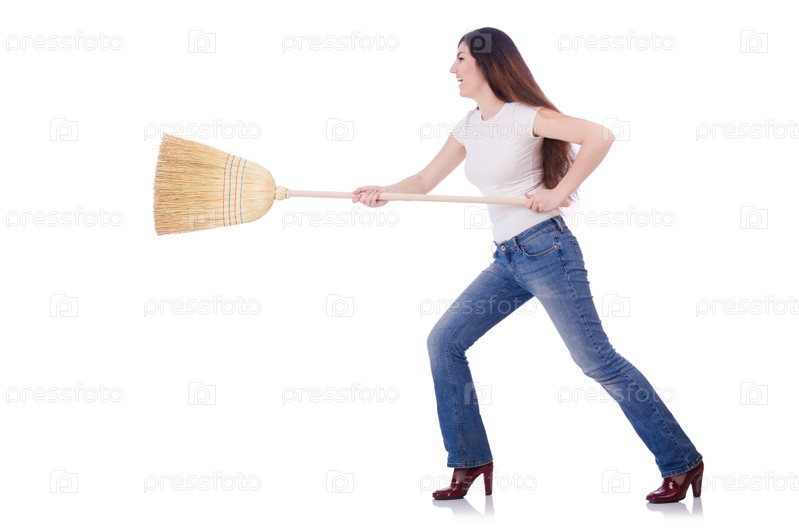 Молодая женщина с веником, изолированная на белом фоне