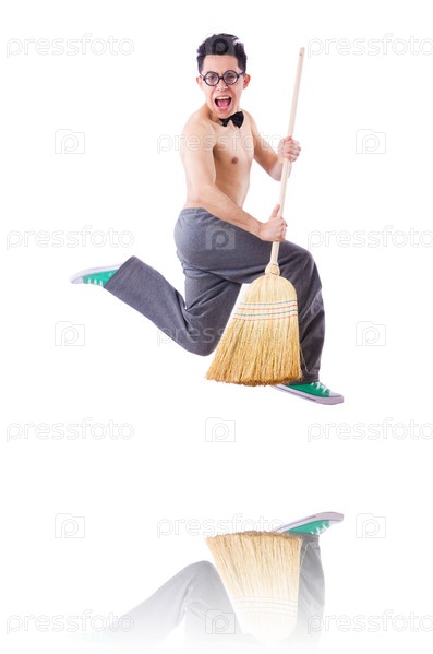 Забавный человек с веником на белом фоне