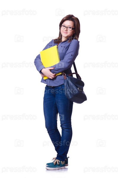 Девушка студент с книгами на белом фоне