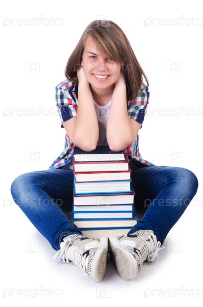 Студентка с книгами на белом