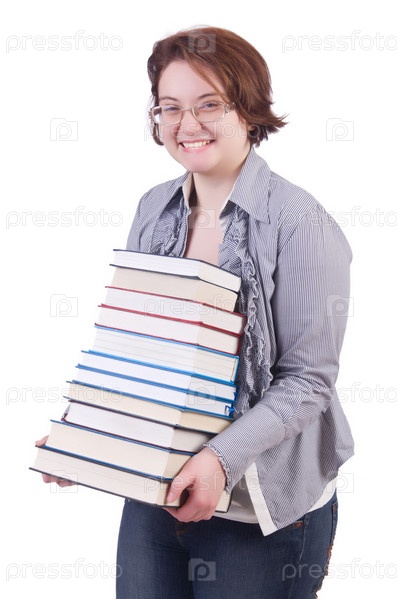 Студентка с книгами на белом