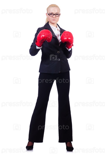 Бизнес-леди с боксерскими перчатками на белом