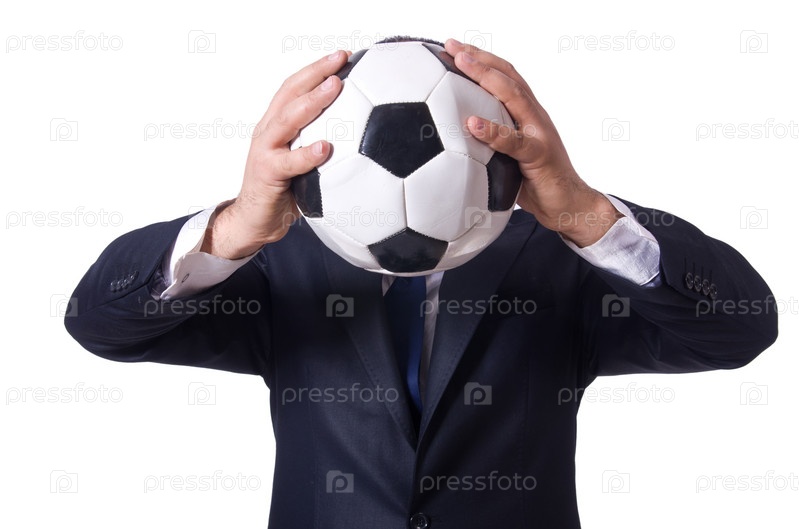 Бизнесмен с футбольным мячом на белом фоне