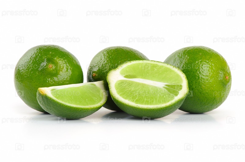 Ломтики и целые лаймы. Изолированные на белом
