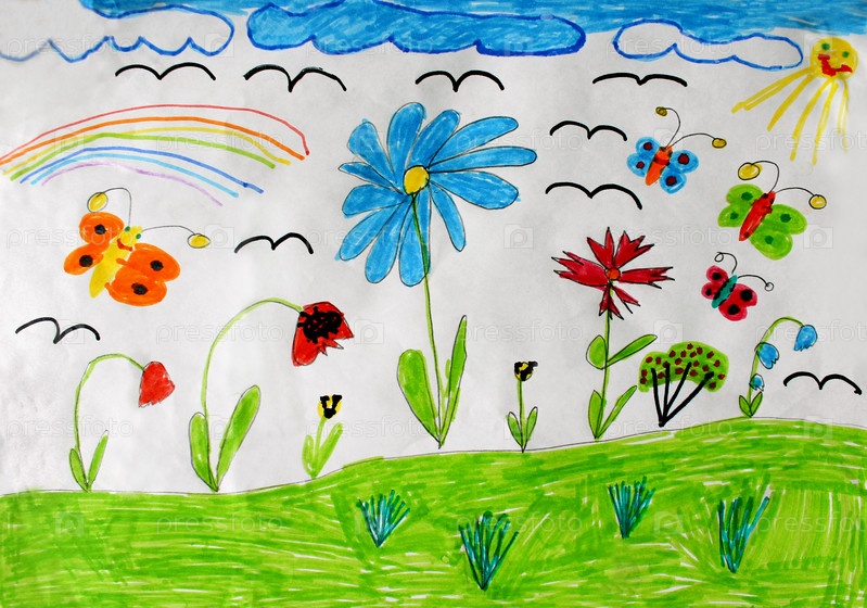 Детский рисунок с бабочками и цветами