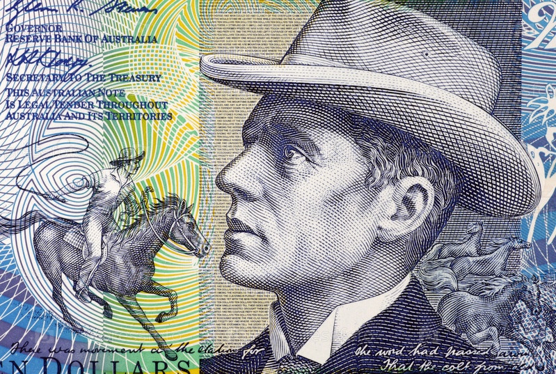 Банджо Патерсон (1864 — 1941) на купюре 10 долларов 2007 года из Австралии. Австралийский поэт, журналист и автор
