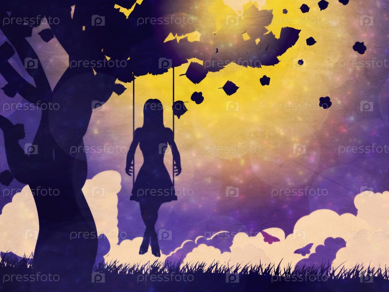 Силуэт девушки на качелях в ночное время