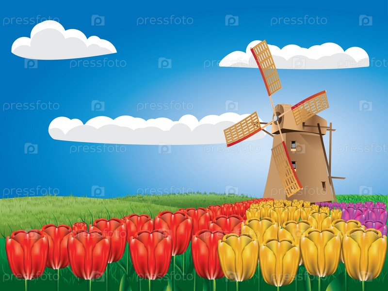 Ветряная мельница и тюльпаны