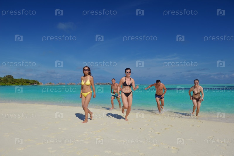 Группа счастливых молодых людей отдыхают на пляже