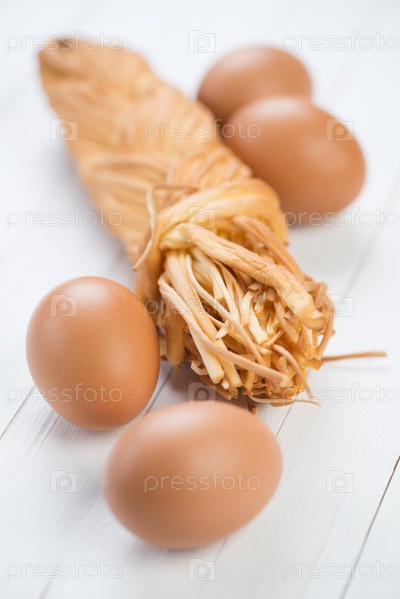 Коричневые куриные яйца и плетеный сыр, крупный план