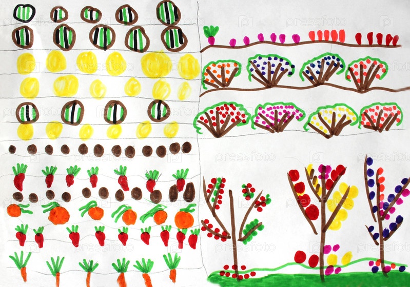 Детский рисунок, овощи и фрукты на грядках