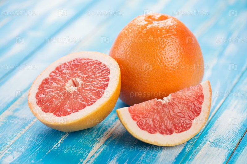 Фрукты: свежие спелые грейпфруты на деревянных досках, студия