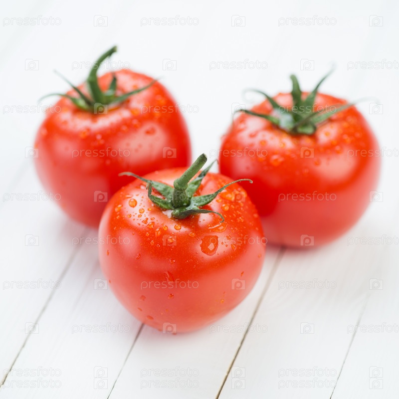 Три свежих красных помидора на деревянных досках, студия