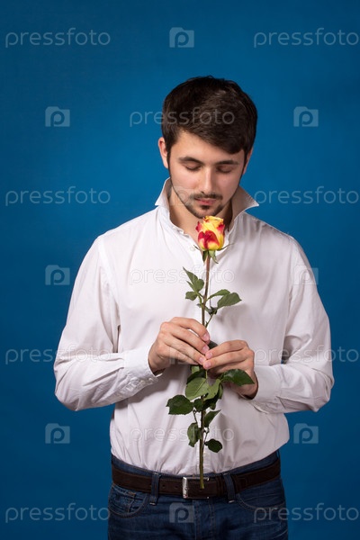 Молодой человек, смотрящий на красную розу, на синем фоне