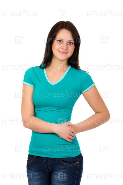 Молодая женщина в зеленой футболке и джинсах позирует на белом фоне