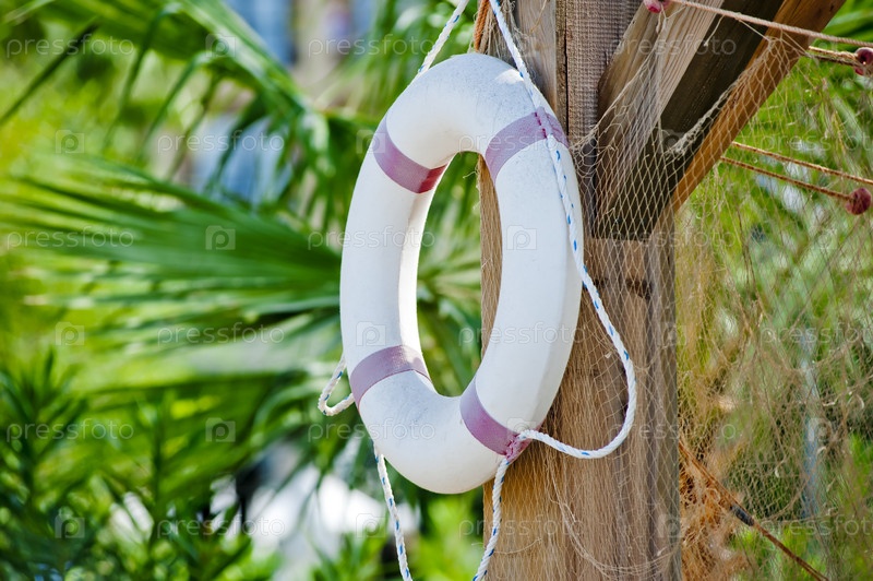 Белый спасательный круг висит на деревянном столбе
