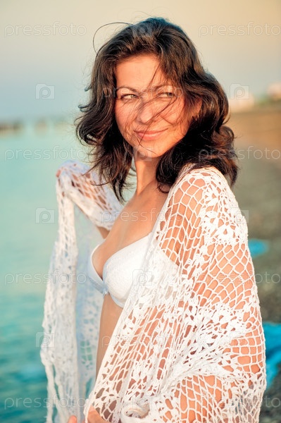 Счастливая девушка в белой шали на пляже