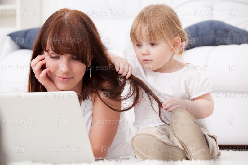 Счастливая молодая мать и ее дочь используют ноутбук