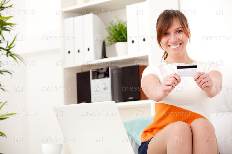 Женщина с ноутбуком и кредитной картой сидит на диване