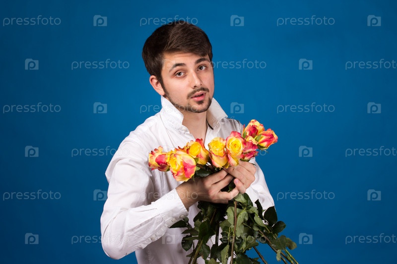 Мужчина с букетом из красных роз