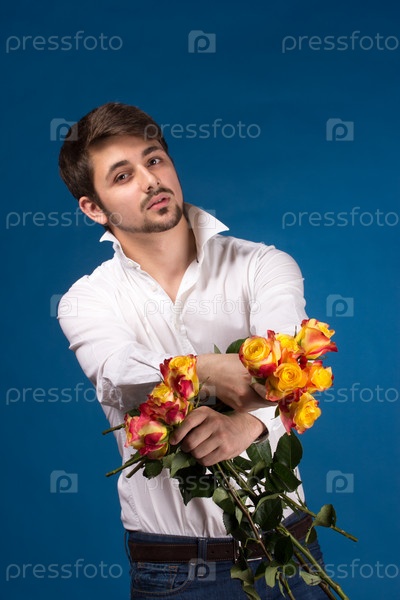 Мужчина с букетом из красных роз