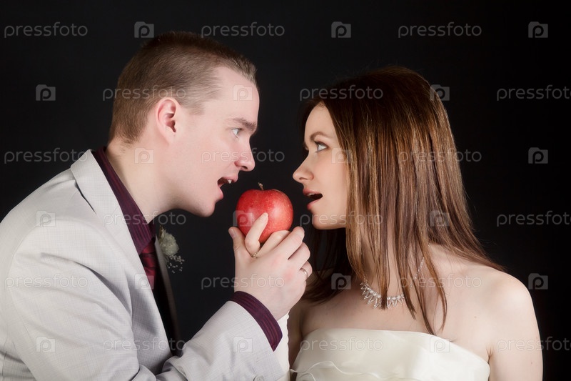 Молодые влюбленные женщина и мужчина кусают яблоко