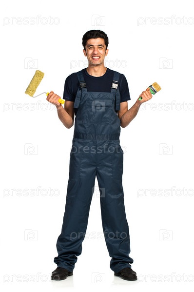 Ремонтник арабской национальности в спецодежде на белом фоне