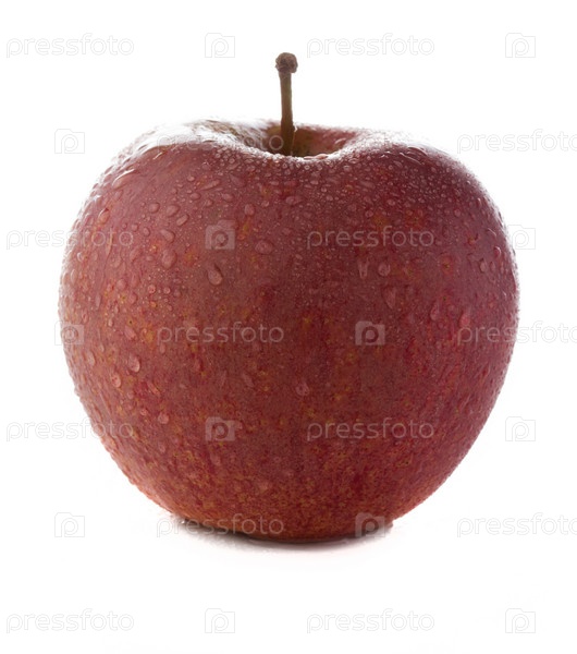 Свежее яблоко с каплями воды, изолированное на белом фоне
