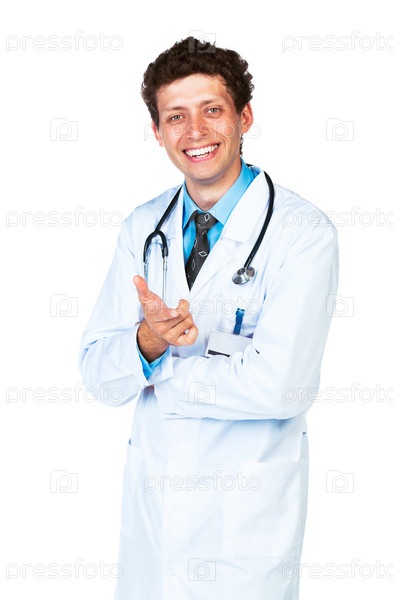 Портрет улыбающегося врача, показывающего на зрителя