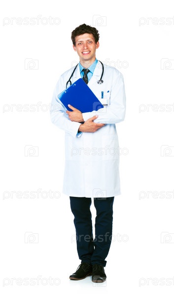 Молодой врач с планшетом на белом фоне