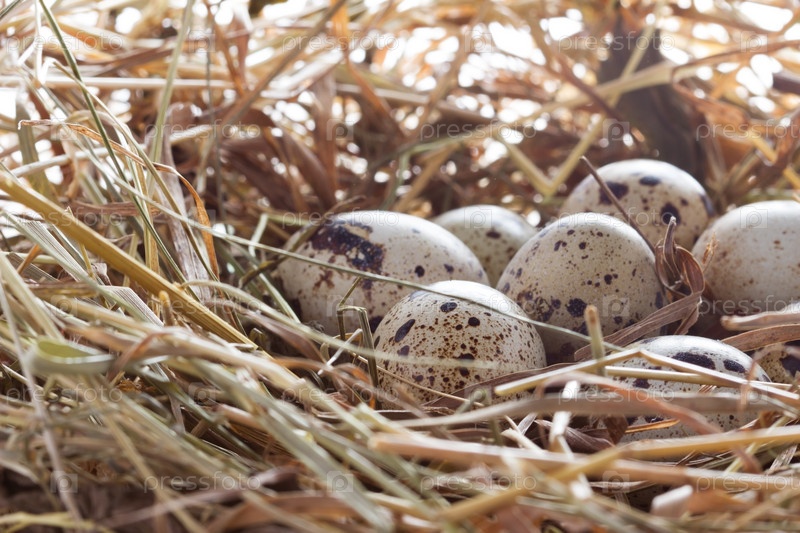 Перепелиные яйца в соломенном гнезде крупным планом