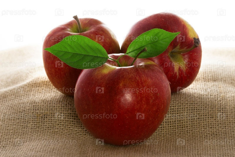 Спелые красные яблоки с зелеными листьями на мешковине