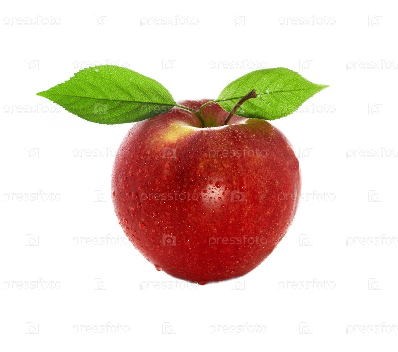 Свежее яблоко с зеленым листом и каплями воды, изолированное на белом фоне