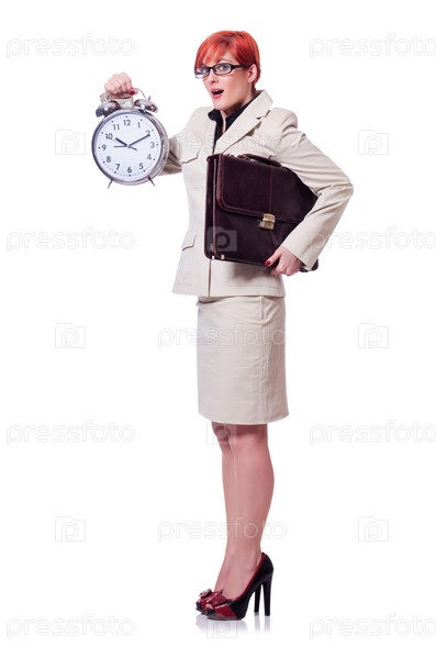 Женщина с часами, изолированная на белом фоне