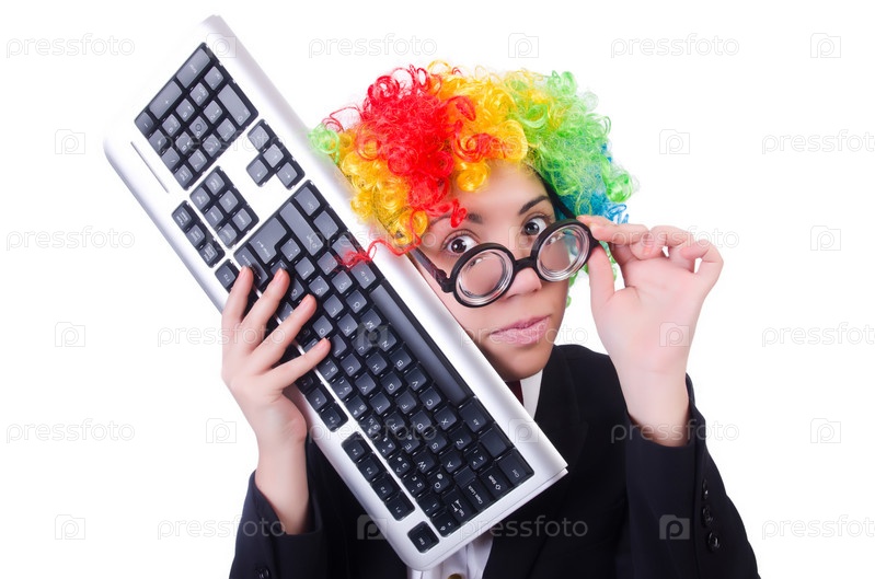 Забавный клоун с клавиатурой на белом фоне