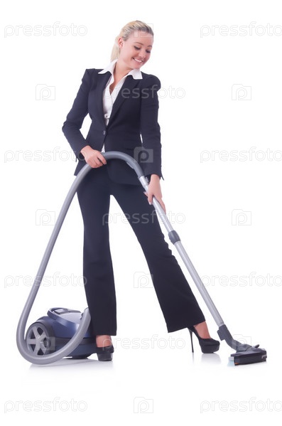Бизнес-леди с пылесосом на белом фоне