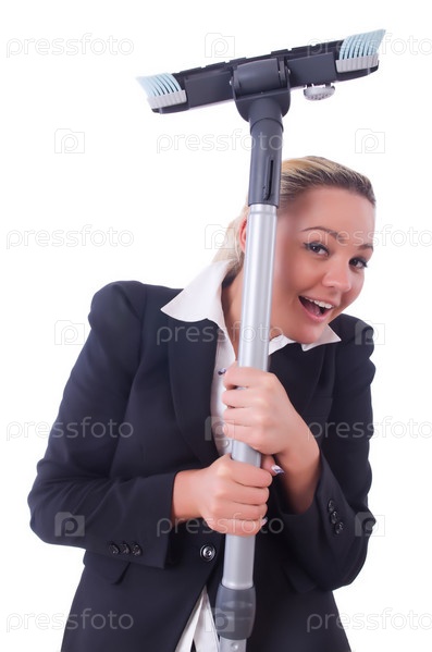 Бизнес-леди с пылесосом на белом фоне