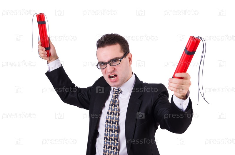 Бизнесмен с динамитом, изолированный на белом фоне