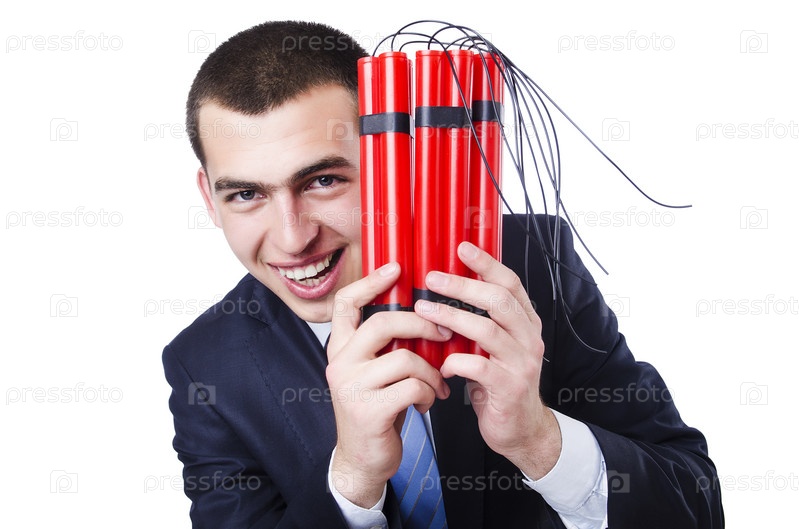 Бизнесмен с динамитом, изолированный на белом фоне