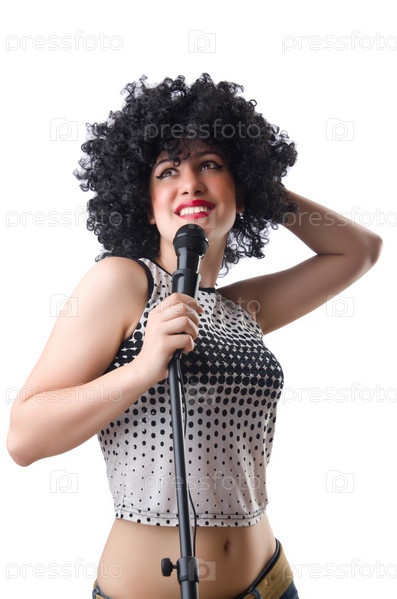 Поп-звезда с микрофоном на белом фоне