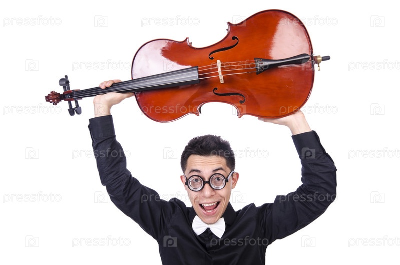 Забавный мужчина со скрипкой на белом фоне