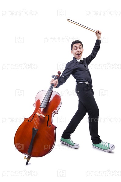 Забавный мужчина со скрипкой на белом фоне