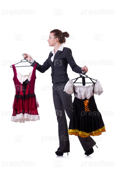 Женщина пытается выбрать платье на белом фоне