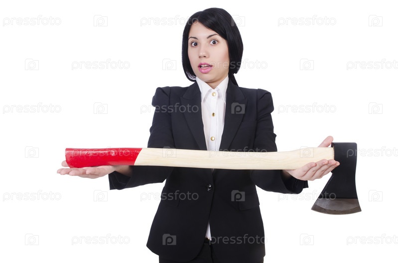 Сделовая женщина с топором на белом фоне