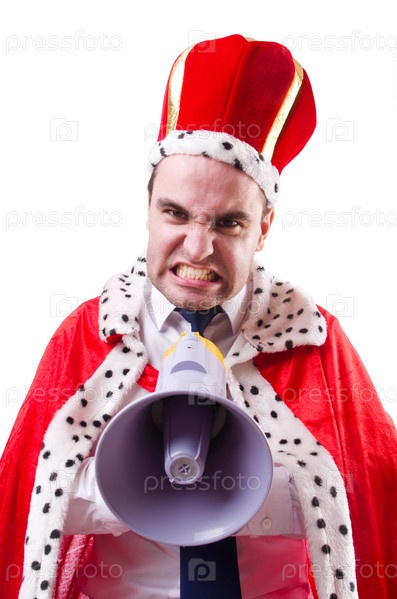 Король-бизнесмен с громкоговорителем, изолированный на белом фоне