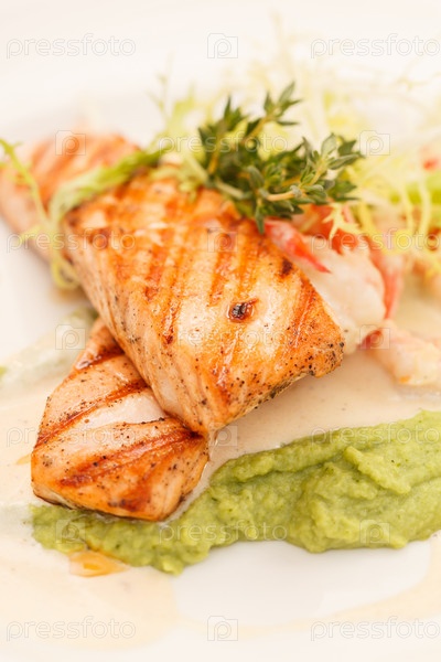 Жареный стейк из лосося с салатом
