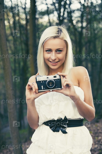 Красивая девушка со старой фотокамерой