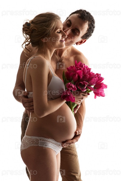 Портрет молодой беременной пары с цветами