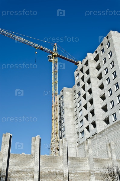 Строительный кран на фоне голубого неба и строящегося дома