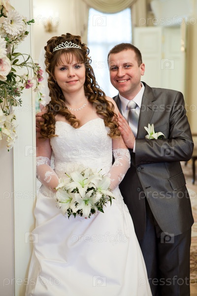 Счастливая пара молодоженов. Белое платье и серый костюм. Букет из лилий в руках